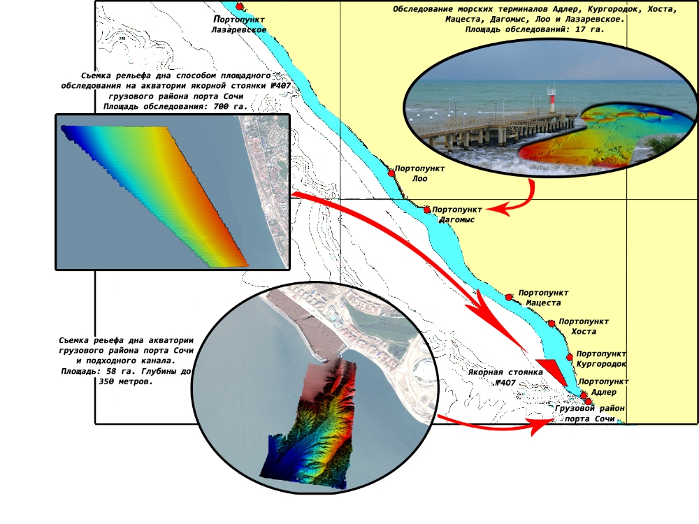 В 2013 году нами был выполнен ряд проектов на Черном море. Все работы были предназначены для обеспечения безопасности мореплавания и контроля параметров габаритов судоходных объектов. В районе была проведена большая работа по развитию геодезической сети и определению локальных параметров перевода координат WGS-84 ↔ СК-42. Материалы по всем объектам прошли техническую экспертизу в 280 ЦКП ВМФ.